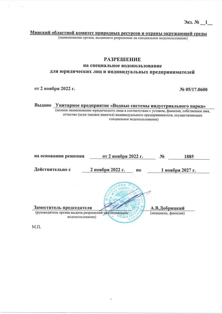 В настоящее время предприятие осуществляет водоснабжение всех объектов индустриального парка (водозабор «Парк-1»), прием и очистку сточных вод на очистных сооружениях сточных вод с выпуском в р. Уша (станция очистки сточных вод), прием и очистку сточных вод на очистных сооружениях поверхностных сточных вод с выпуском в р. Уша (очистные сооружения дождевых сточных вод). Деятельность по водоснабжению и водоотведению осуществляется на основании Разрешения на специального водопользование, выданного Минским областным комитетом природных ресурсов и охраны окружающей среды.