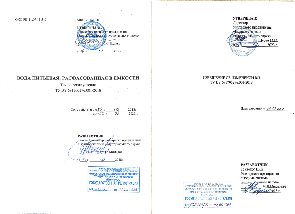 Цех по розливу воды, расфасованной в емкости имеет санитарно-гигиеническое заключение, выданное Смолевичским РЦГиЭ, что свидетельствует о том, что все технологическое оборудование, задействованное в технологическом процессе, соответствует требованиям законодательства Республики Беларусь в области санитарно-эпидемиологического благополучия населения.