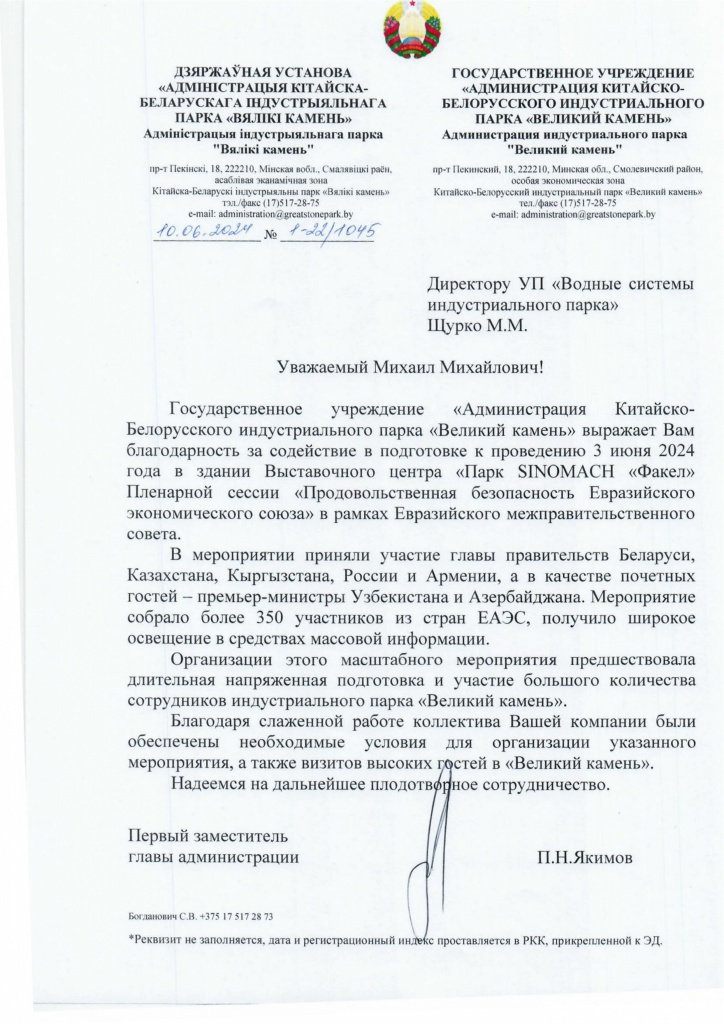 Объявлена благодарность за содействие в подготовке 3 июня 2024 года в здании Выставочного центра "Парка SINOMACH "Факел"" Пленарной сессии "Продовольственная безопасность Евразийского экономического союза" в рамках Евразийского межправительственного совета